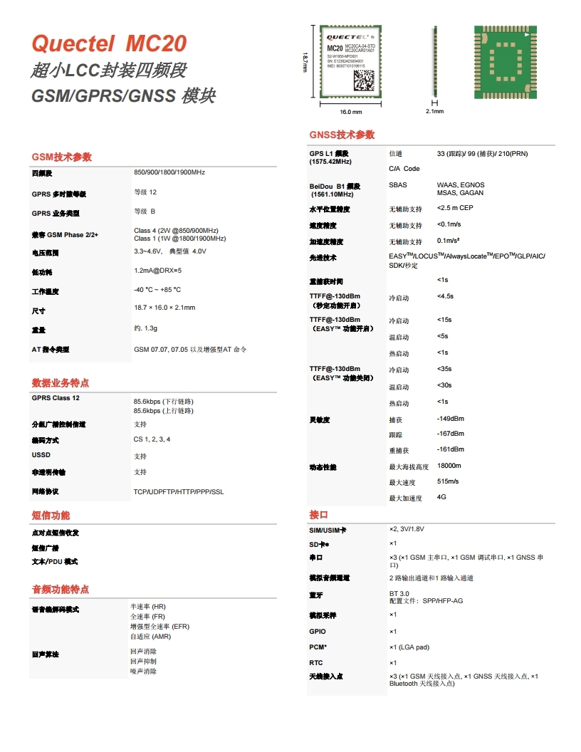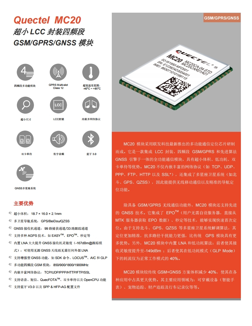 MC20模块采用联发科技最新推出的多功能通信定位芯片研制而成。它是一款集成LCC封装、四频段GSM/GPRS和先进算法GNSS引擎于一体的全功能通信模块,具有超小体积、低功耗、双卡单待等优势。