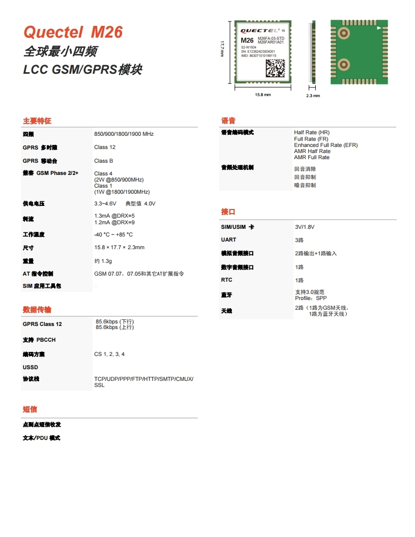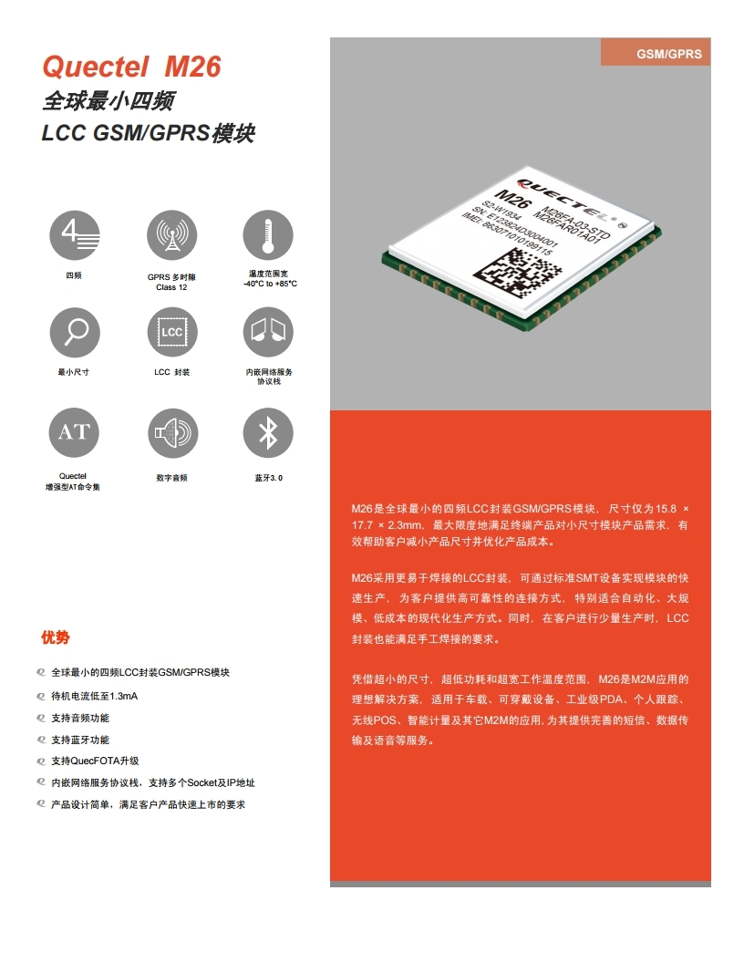 M26是一款超小的四频LCC封装GSM/GPRS模块,尺寸仅为15.8mm×17.7mm×2.3mm,最大限度地满足终端产品对小尺寸模块产品需求,有效帮助客户减小产品尺寸并优化产品成本。