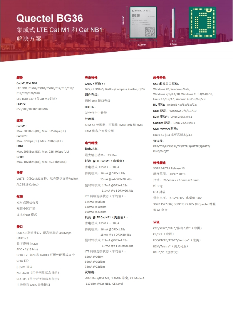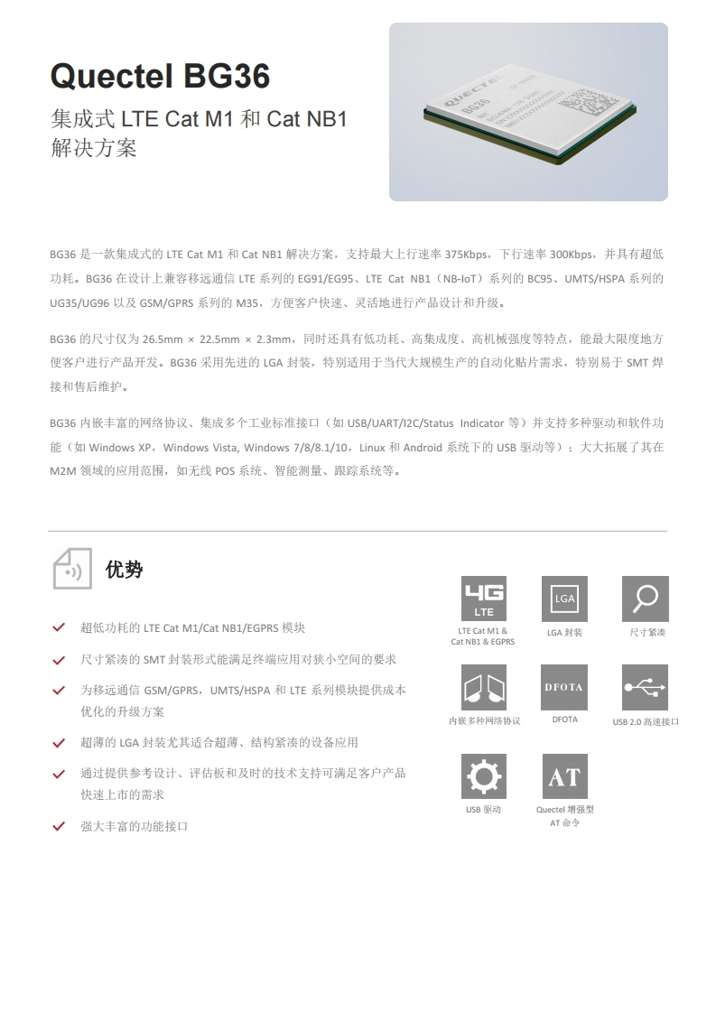 BG36 是一款集成式的 LTE Cat M1 和 Cat NB1 解决方案,支持最大上行速率 375kbps和下行速率 300kbps,并具有超低功耗。BG36 在设计上兼容移远通信 LTE 系列的EG91/EG95,Cat NB1(NB-IoT)系列的 BC95,