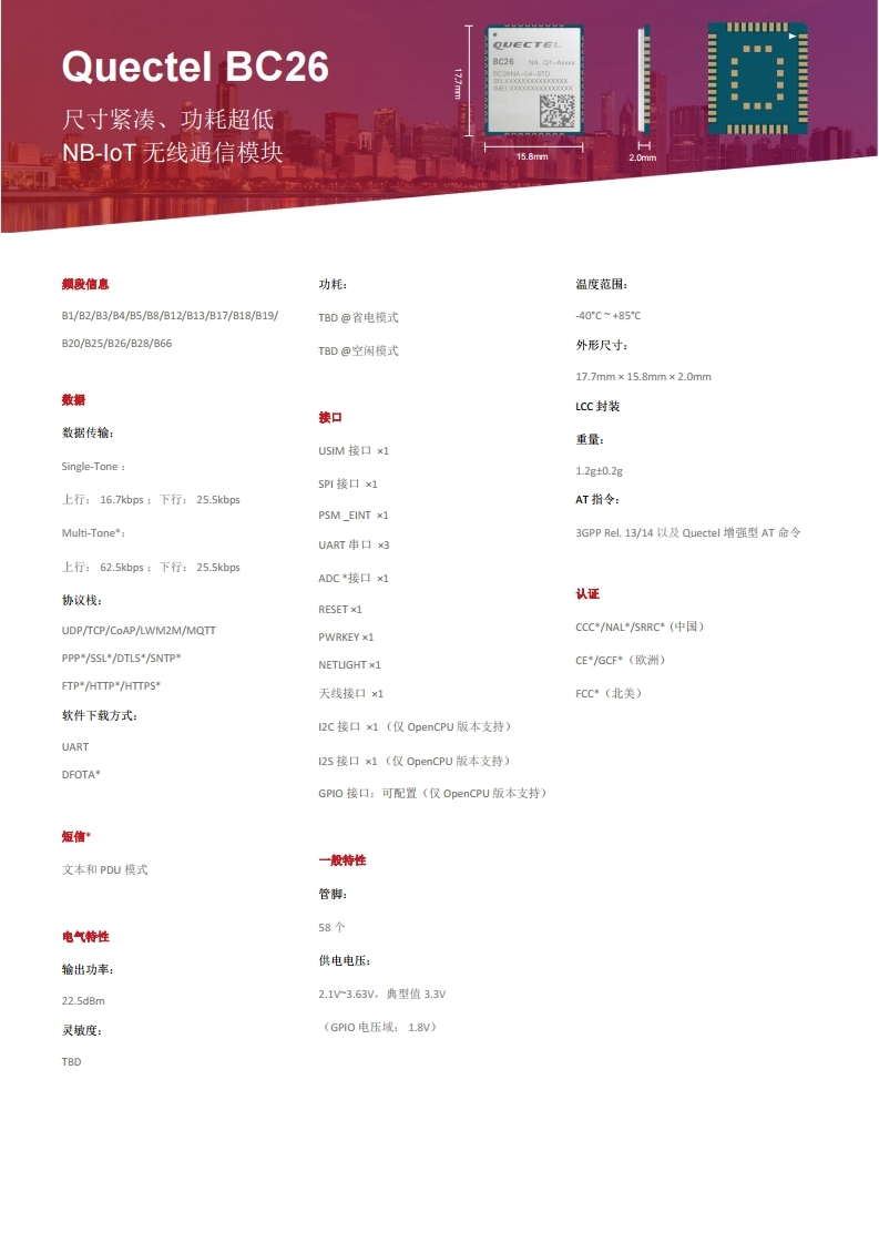 BC26是一款高性能、低功耗、多频段的NB-IoT无线通信模块。其尺寸仅为17.7mm × 15.8mm × 2.0mm,能最大限度地满足终端设备对小尺寸模块产品的需求,同时有效帮助客户减小产品尺寸并优化产品成本。