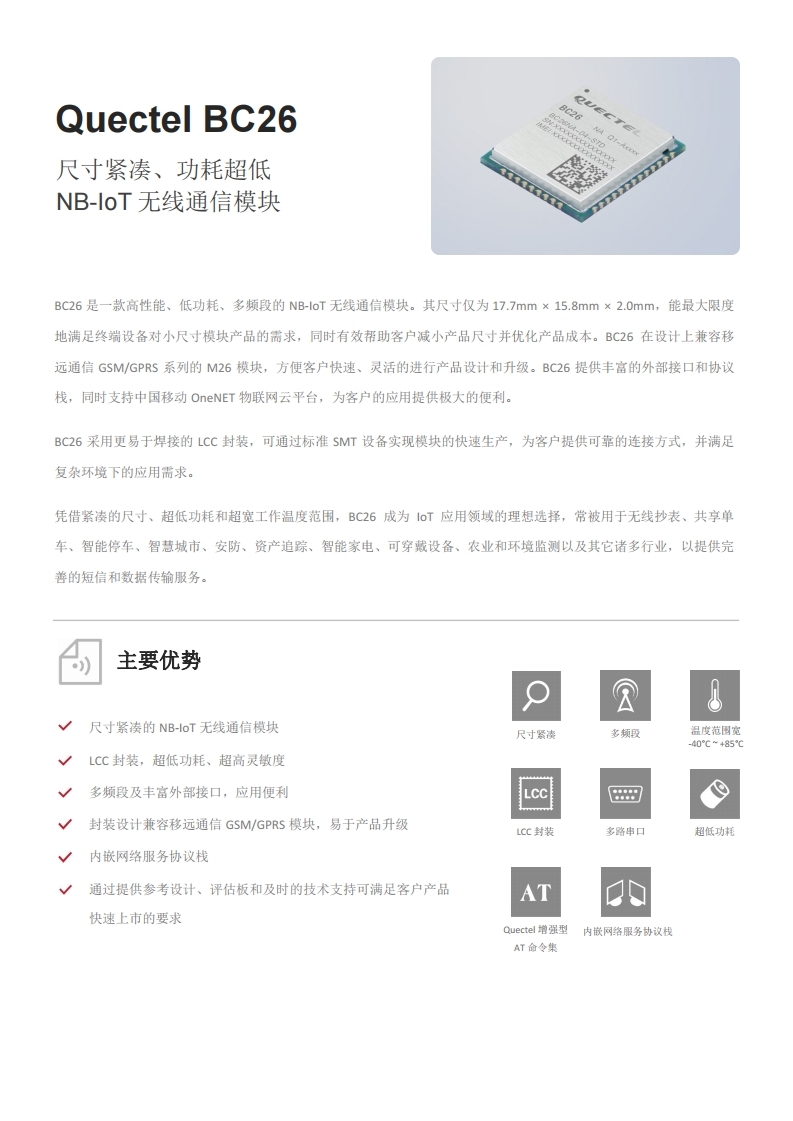 BC26在设计上兼容移远通信GSM/GPRS系列的M26模块,方便客户快速、灵活的进行产品设计和升级。