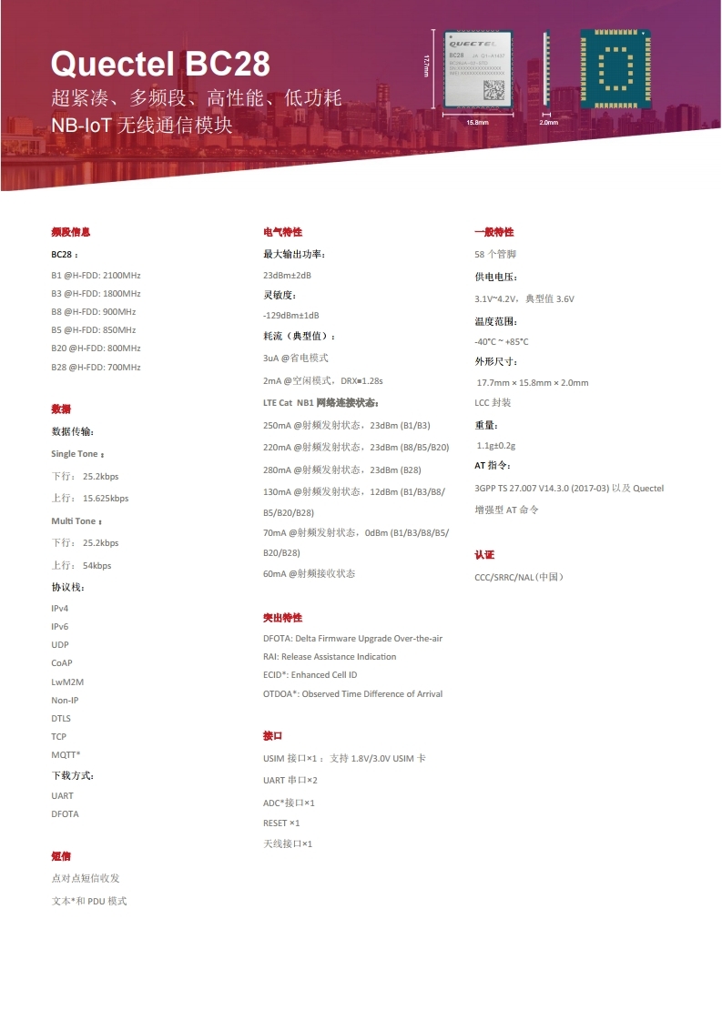 BC28是一款超紧凑、高性能、低功耗的多频段NB-IoT无线通信模块,支持B1/B3/B8/B5/B20/B28*频段。其尺寸仅为17.7mm × 15.8mm × 2.0mm,能最大限度地满足终端设备对小尺寸模块产品的需求,同时有效地帮助客户减小产品尺寸并优化产品成本。