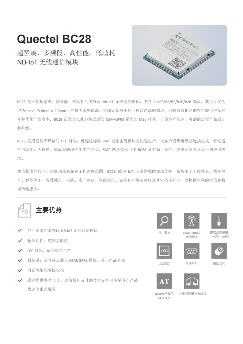 BC28在设计上兼容移远通信GSM/GPRS系列的M26模块,方便客户快速、灵活的进行产品设计和升级。