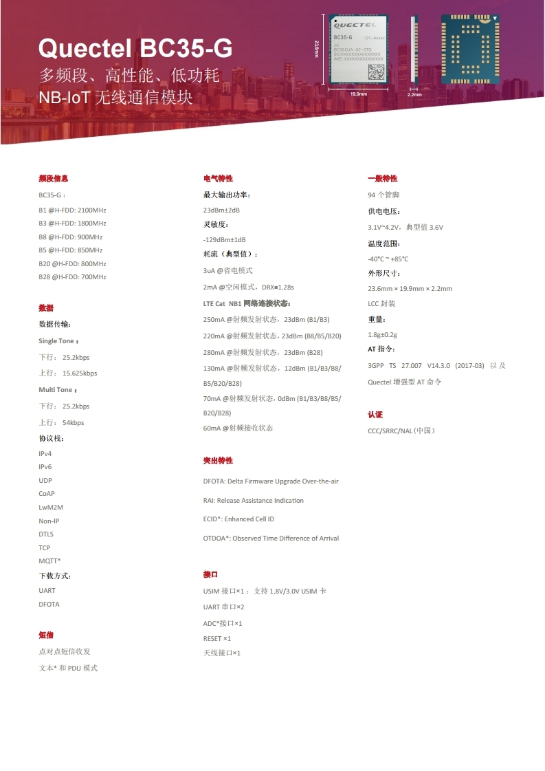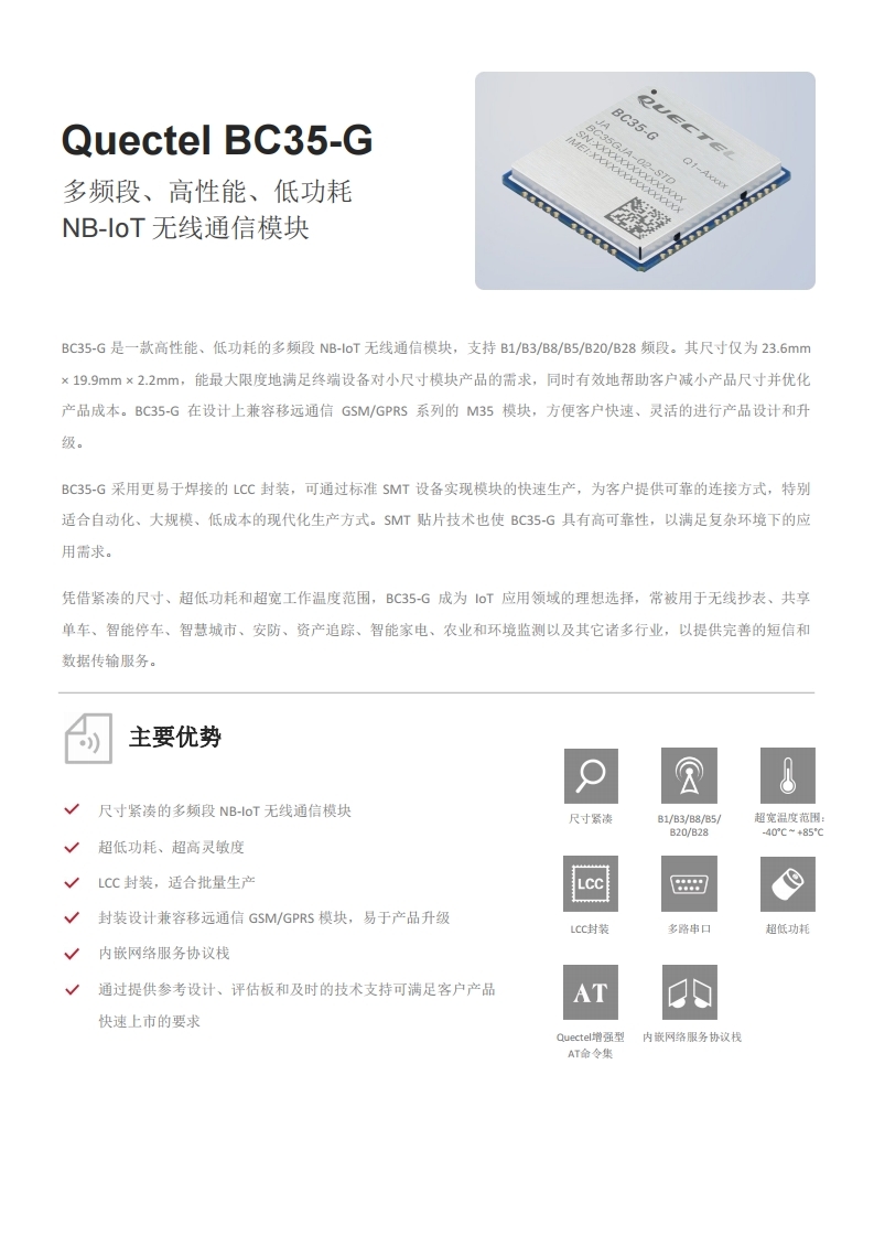 BC35-G是一款高性能、低功耗的多频段NB-IoT无线通信模块,支持B1/B3/B8/B5/B20/B28*频段。其尺寸仅为23.6mm × 19.9mm × 2.2mm,能最大限度地满足终端设备对小尺寸模块产品的需求,同时有效地帮助客户减小产品尺寸并优化产品成本。