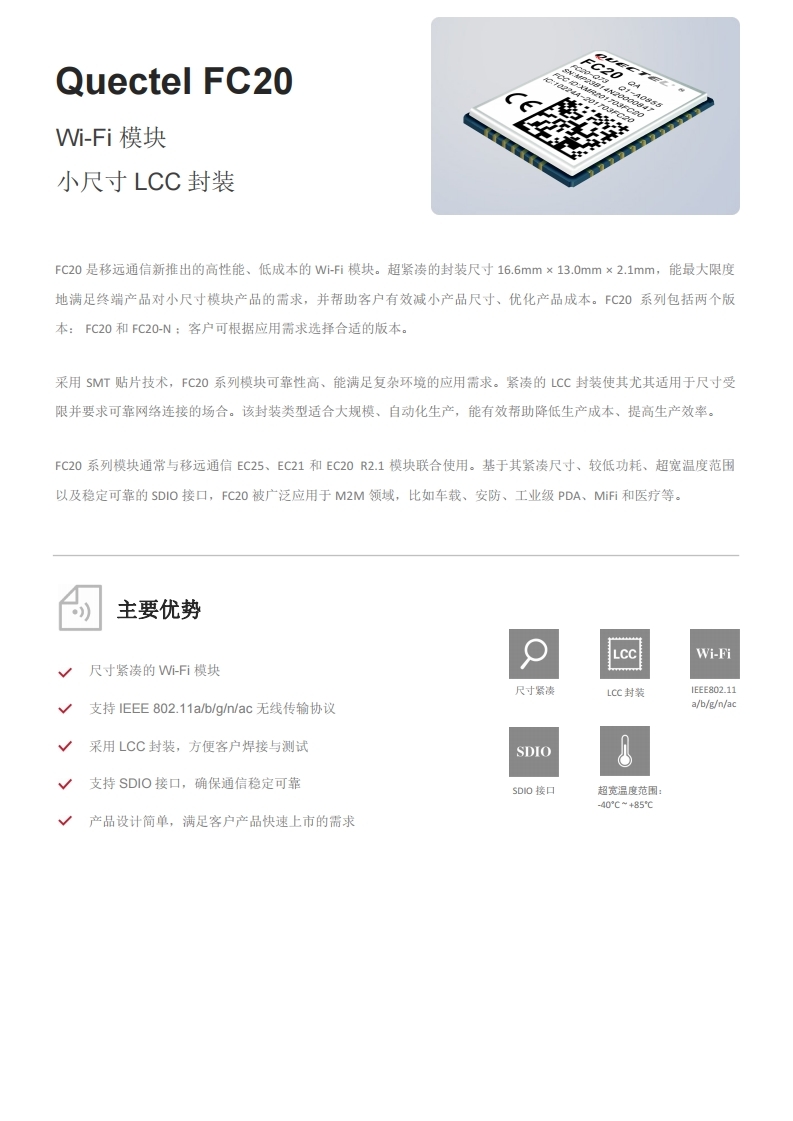 FC20 是移远通信新推出的高性能、低成本的 Wi-Fi 模块。超紧凑的封装尺寸 16.6mm × 13.0mm × 2.1mm,能最大限度地满足终端产品对小尺寸模块产品的需求,并帮助客户有效减小产品尺寸、优化产品成本。FC20 系列包括两个版本:FC20 和 FC20-N;客户可根据应用需求选择合适的版本。